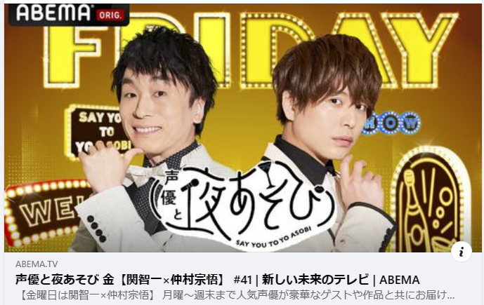2023年3月24日のABEM TV声優と夜遊びに出演しました。【関智一×仲村宗悟】 #41